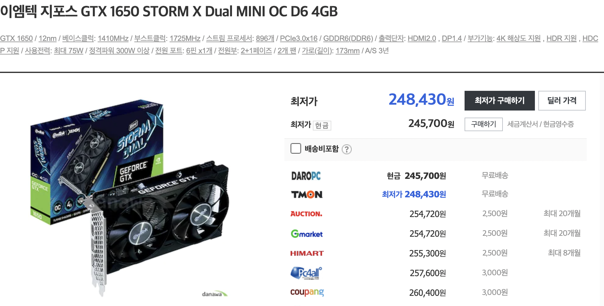 Cuda코어 (스트림프로세서)에서 128개 가까이 차이가 나고, TFLOP에서는 각각 3TFLOP, 2.1TFLOP을 가지고 있다. VRAM을 살펴보면 용량이 둘다 4GB로 동일하지만, 종류는 전자가 GDDR6으로 한 세대 앞선다. TDP는 둘다 75W인것을 확인할 수 있다. 낮은 TDP덕분에 보조전원도 필요가 없었다. 벤치마크 점수로도 거의 1.5배 차이가 나고 내가 배운 지식으로 비교를 해도 거의 모든분야에서 전자가 뚜렷하게 앞서는 것이 보였다. 무엇보다 1980x1080fhd 240hz 모니터를 기준으로 300fps가 넘는 프레임을 뽑아낼 수 있어서 GTX1650을 선택을 하게 되었다.