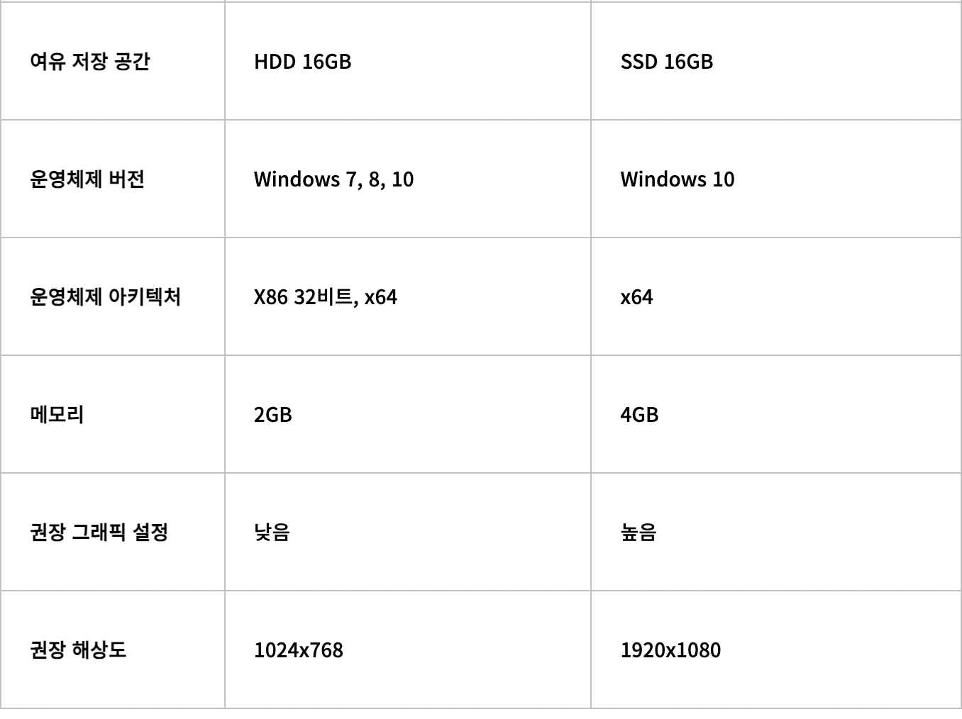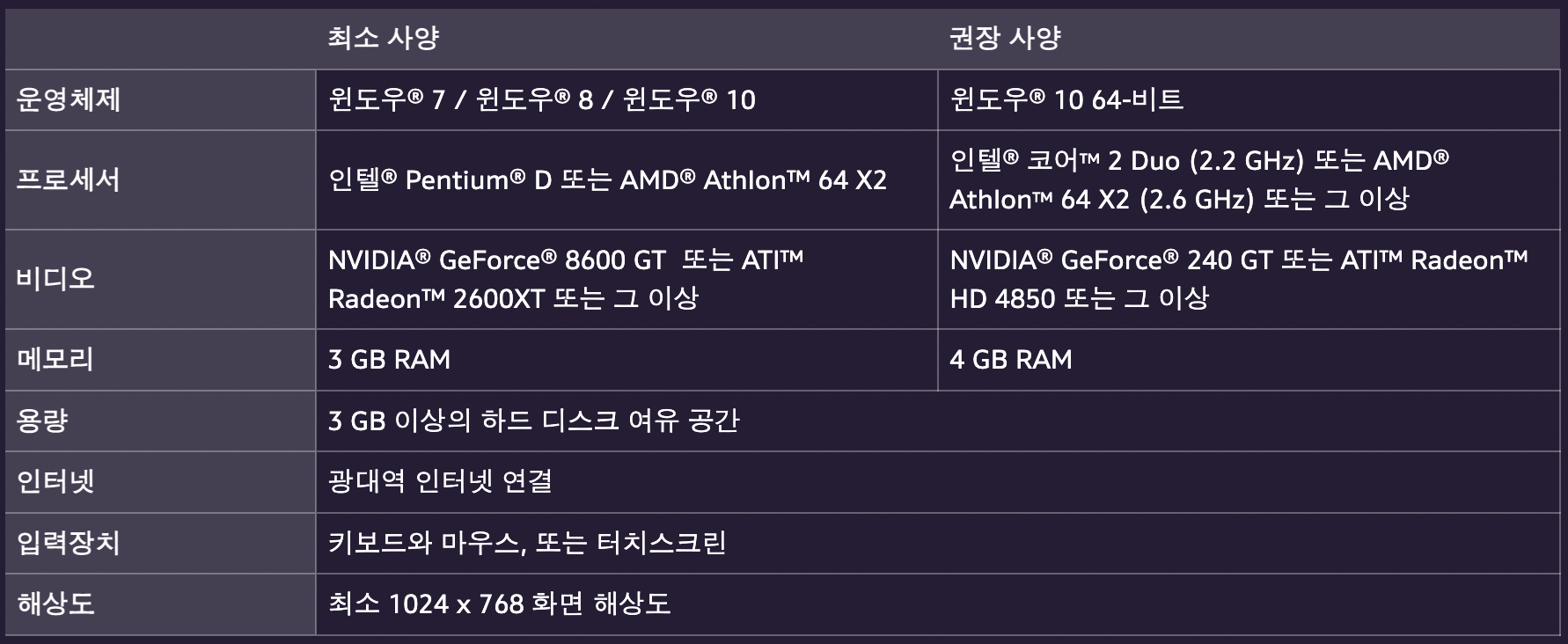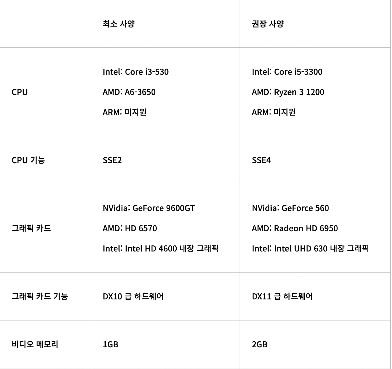 그래픽 카드 : GeForce 560 이상 (VRAM 2GB이상)
