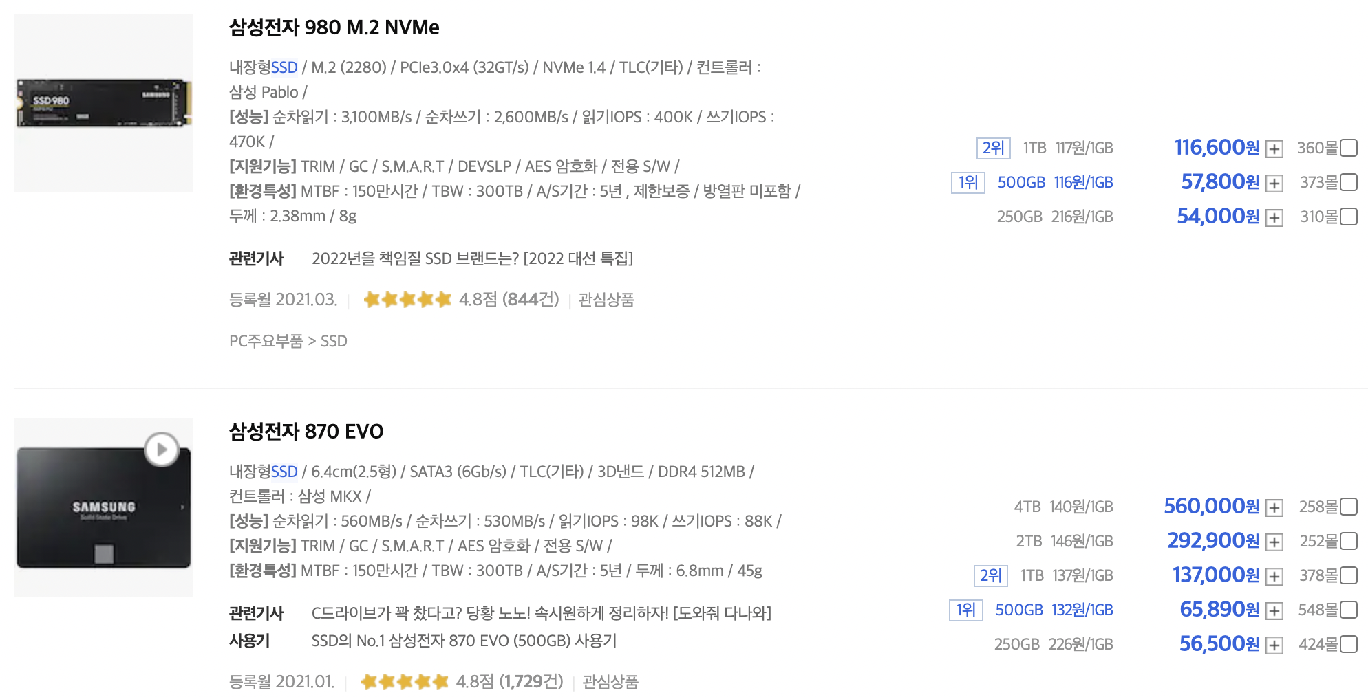국내제품 삼성전자 제품을 찾던도중 굉장히 합리적인 제품을 발견했다. 저번 포스팅에서 배운 M.2칩과 2.5형 ssd가 눈에 들어왔는데 오히려 차세대 SSD인 M.2칩이 더 쌌다. 성능면에서도 읽기 쓰기 속도가 전자가 약 6배 빨랐고, SATA3형식이 아니기 때문에 케이블이 필요없어 훨씬 깔끔하게 정리 가능한 삼성전자 980 M.2 NVMe 500gb제품을 선택했다. 단, M.2칩이 호환가능한 메인보드를 골라야함에 주의해야 한다.