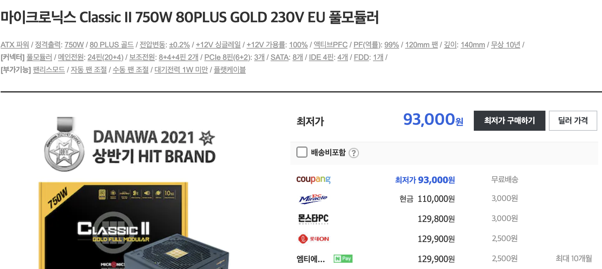 이 기준에 부합하는 제품을 찾아보니 마이크로닉스 Classic ll 750W 제품이 80 PLUS 골드 급(전력효율등급) 제품중에서 가장 저렴한 것을 발견했다. ATX파워임을 참고해서 케이스 선정을 진행한다.