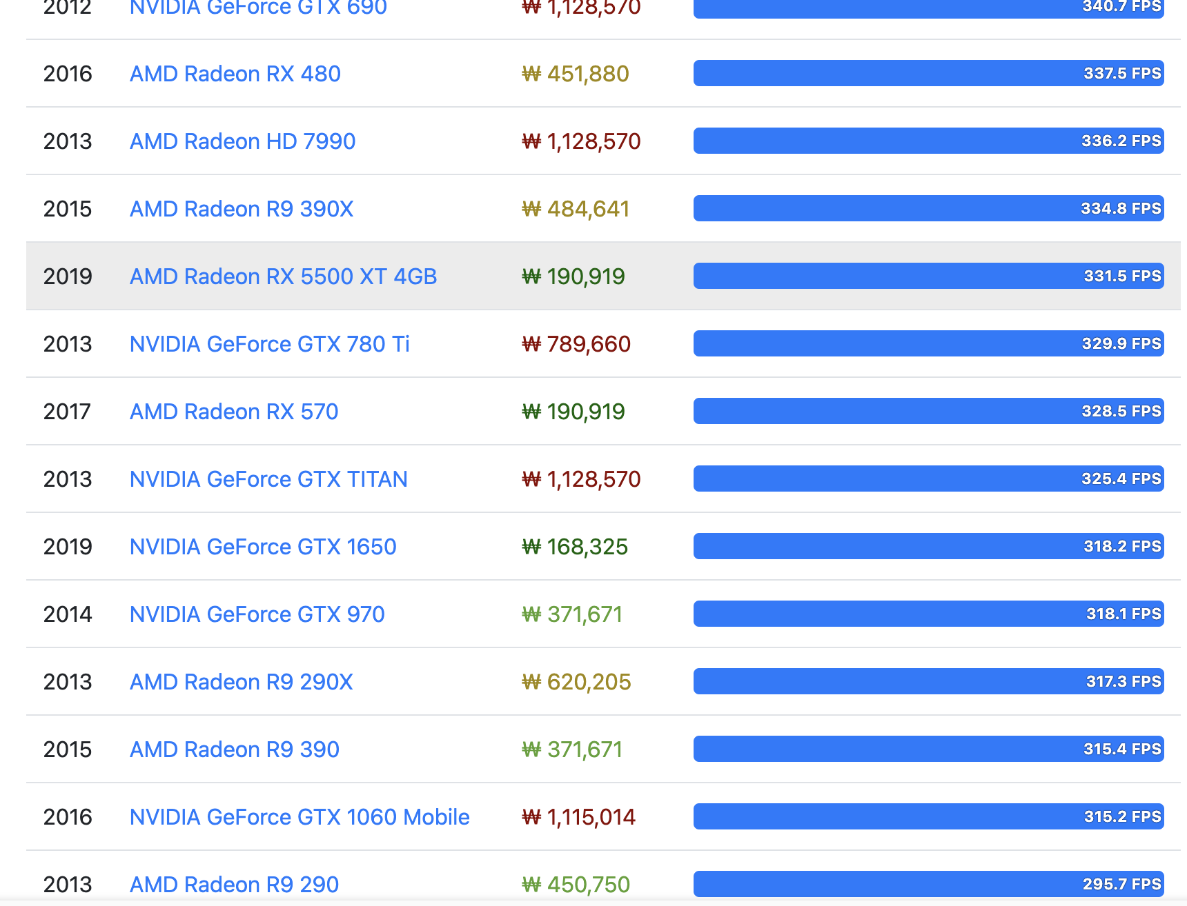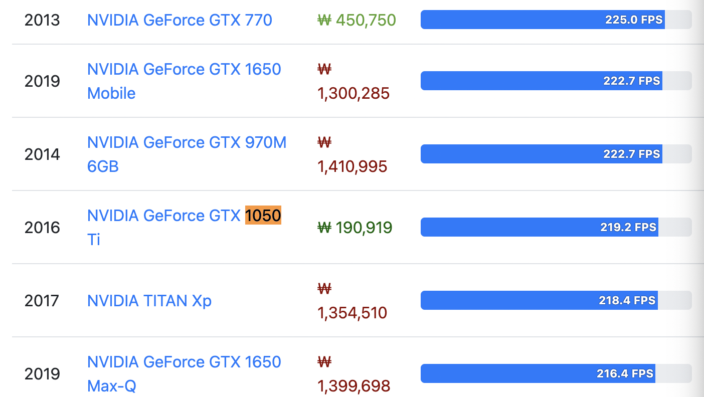 어떤 cpu를 썼는지는 표시되지 않았지만, 1980x1080의 성능을 참고할 수 있었고 그중 gtx1650이 적당한 가격대에 형성되어 있는 것을 확인했다.