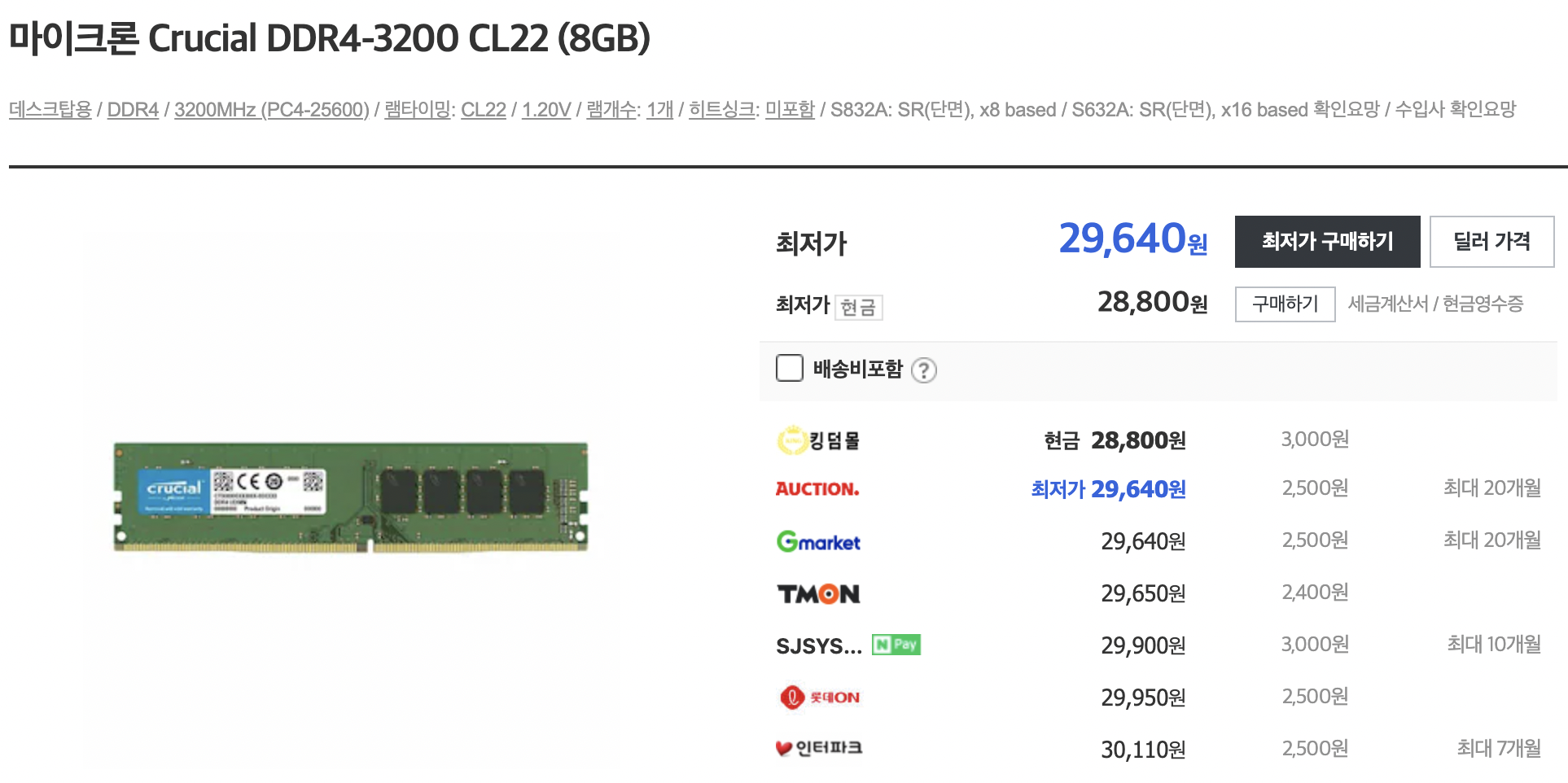 DDR4 타입의 램을 찾던 도중 마이크론과 삼성전자의 램을 발견했다. 램의 성능을 비교하려 했으나 메모리 레이턴시도 똑같고 비교할게 가격밖에 없어 마이크론의 램(8GB*2)을 사기로 했다. 롤에 필요한 램은 4GB이지만, 도중에 유튜브 카톡등 다른 작업을 하려면 다다익램이기 때문이다.