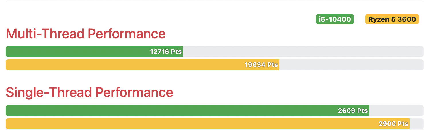일단 저번 포스팅에서 배운 기준을 근거로 성능을 비교해보자. 코어수(둘다 멀티쓰레딩지원)와 쓰레드, TDP는 둘다 같다 기본 클럭과 L3캐시 메모리 용량, 메모리 레이턴시는 ryzen 3600이 우세했고, 최대 클럭은 i5 10400f가 우세했다. 벤치마킹 사이트에서 확인한 싱글쓰레드, 멀티쓰레드 퍼포먼스에서는 후자가 훨씬 좋은 점수를 보여줬다.