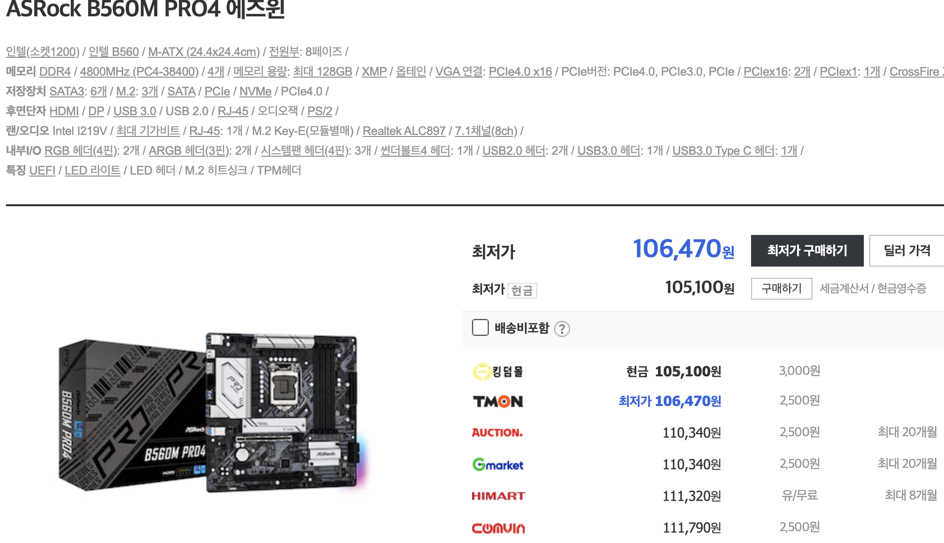 메인보드로는 인텔의 소켓1200(CPU), PCle3.0x16(GPU), M.2(ssd)를 동시에 지원하는 보드를 찾다보니 ASRock B560M PRO4 에즈윈 제품을 선택하게 되었다. 메모리를 DDR4를 지원한다고 하니 RAM을 구입할때 참고해야 한다.