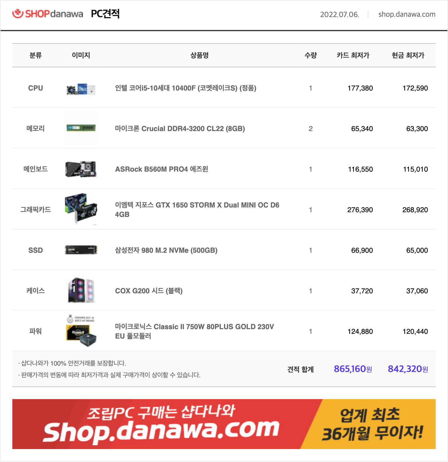 원하는 스펙을 모두 담은 제품을 결과 다나와 현금 최저가 기준 840000원 정도의 견적이 나왔다. 취업하고 첫월급으로 사야겠다.
