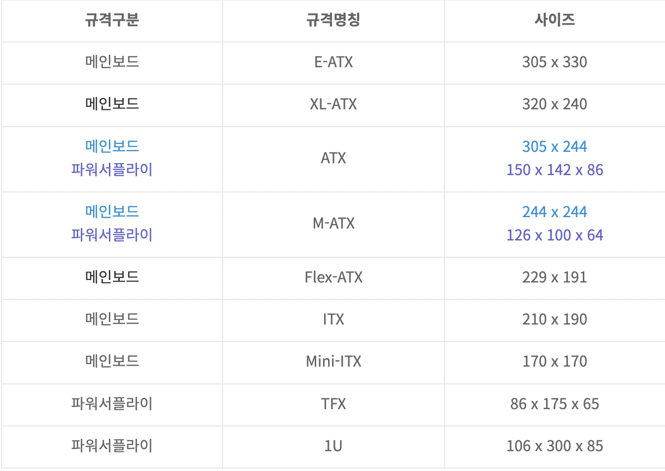 - 케이스 사이즈 : 미니타워, 슬림타워, 미들타워, 빅타워로 구분한다. 메인보드와 파워서플라이 규격을 참고하여 케이스의 사이즈를 선정하한다.